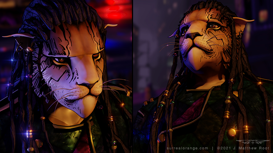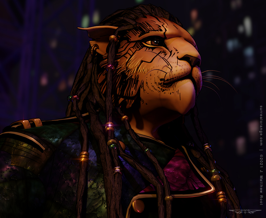 The Captain. He’s the silent type until he knows you and even then he’s not much for talk. He’s all about being a pilot. His ship is The Swift. He’s a music lover and, like Tish, very fond of exotic drink and smokey treats. They’re actually related. Or- they think anyway. Feels right and we’re gonna run with it. Like most true Captains he’s married to his ship and doesn’t much care where they go as long as its somewhere new. He’s all about the horizon.